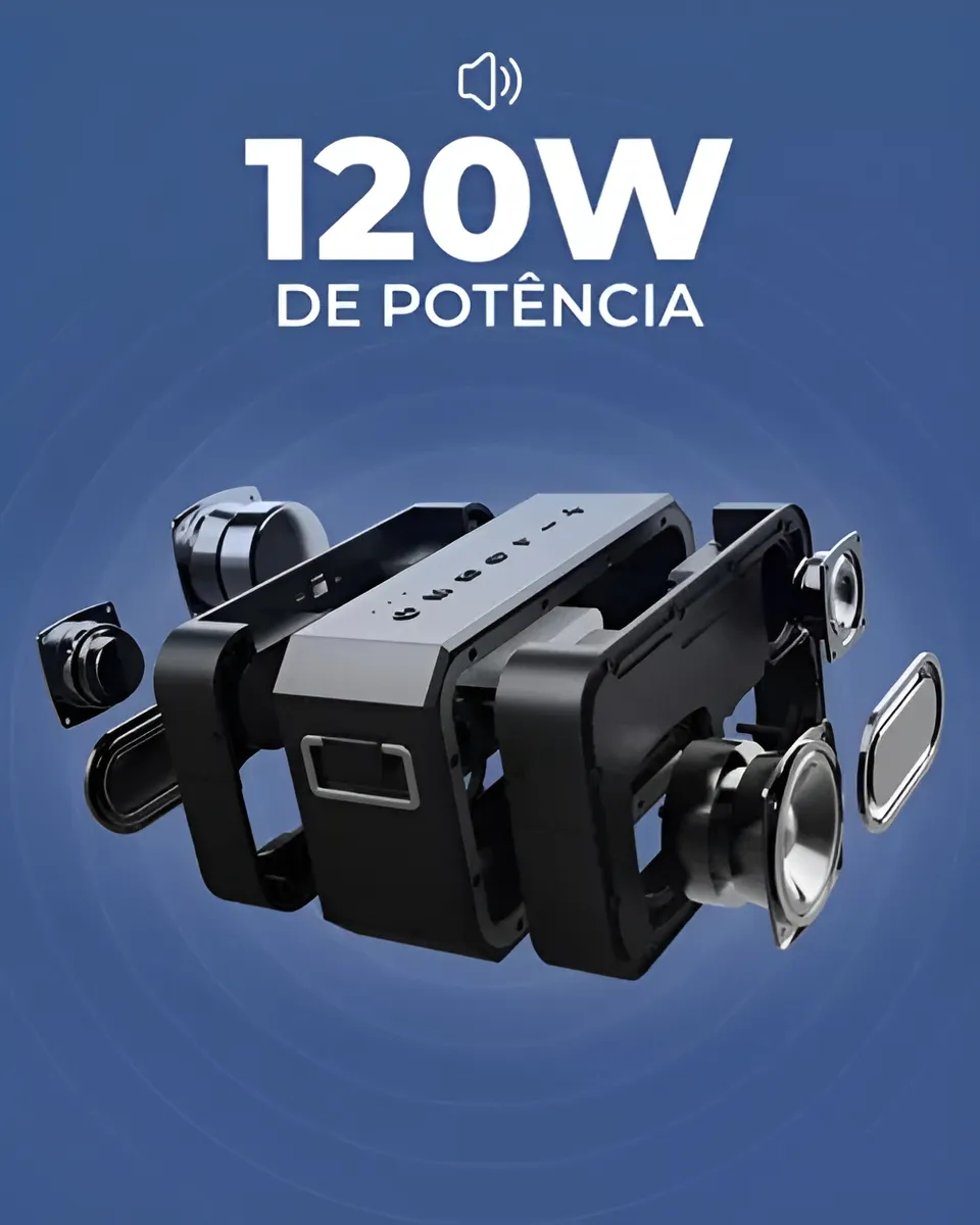 Mesmo potente, ela continua sendo portátil, tem alça resistente e um tamanho prático para levar para qualquer lugar. A bateria dura horas, então você não precisa ficar caçando tomada ou interromper o momento.